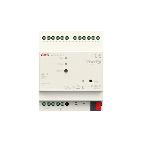 KNX-DALI-2 Gateway, 1/2-Fold is designed for KNX intelligent building control system and used to connect KNX bus and DALI bus. As the interface between KNX installation system and DALI network, messages from the KNX bus can be converted into information that can be identified by the DALI device via this gateway. The information contains the DALI device address and command, and send to the DALI network to control the DALI device, thus to realize the functions of switching, dimming, brightness value, colour temperature, colour control, etc. of various lamps etc. of various lamps with DALI ballasts, while the DALI gateway can request the status of the DALI device, failure detection, and convert the status and failure information into KNX telegrams, and send to the KNX bus.